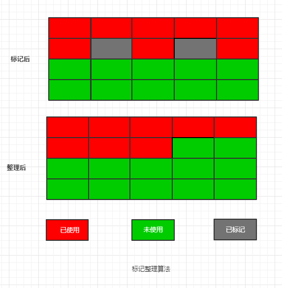 结合了以上两个算法,为了避免缺陷而提出。标记阶段和标记清理算法相同,标记后不是清理对象,而是将存活对象移向内存的一端。然后清除端边界外的对象。实现过程如下图: